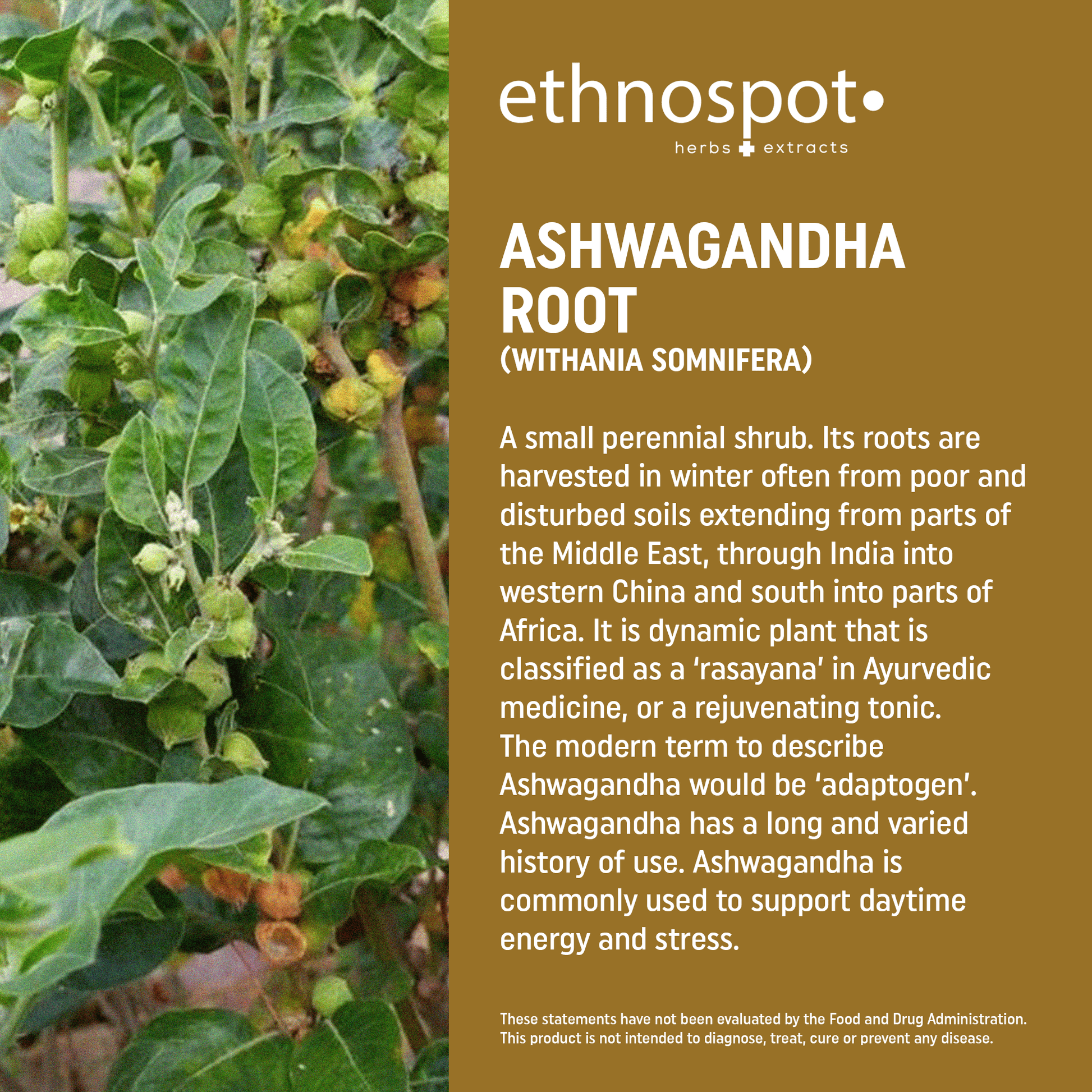 - Withania somnifera, known commonly as ashwagandha or winter cherry, is an evergreen shrub in the Solanaceae or nightshade family that grows in India, the Middle East, and parts of Africa.