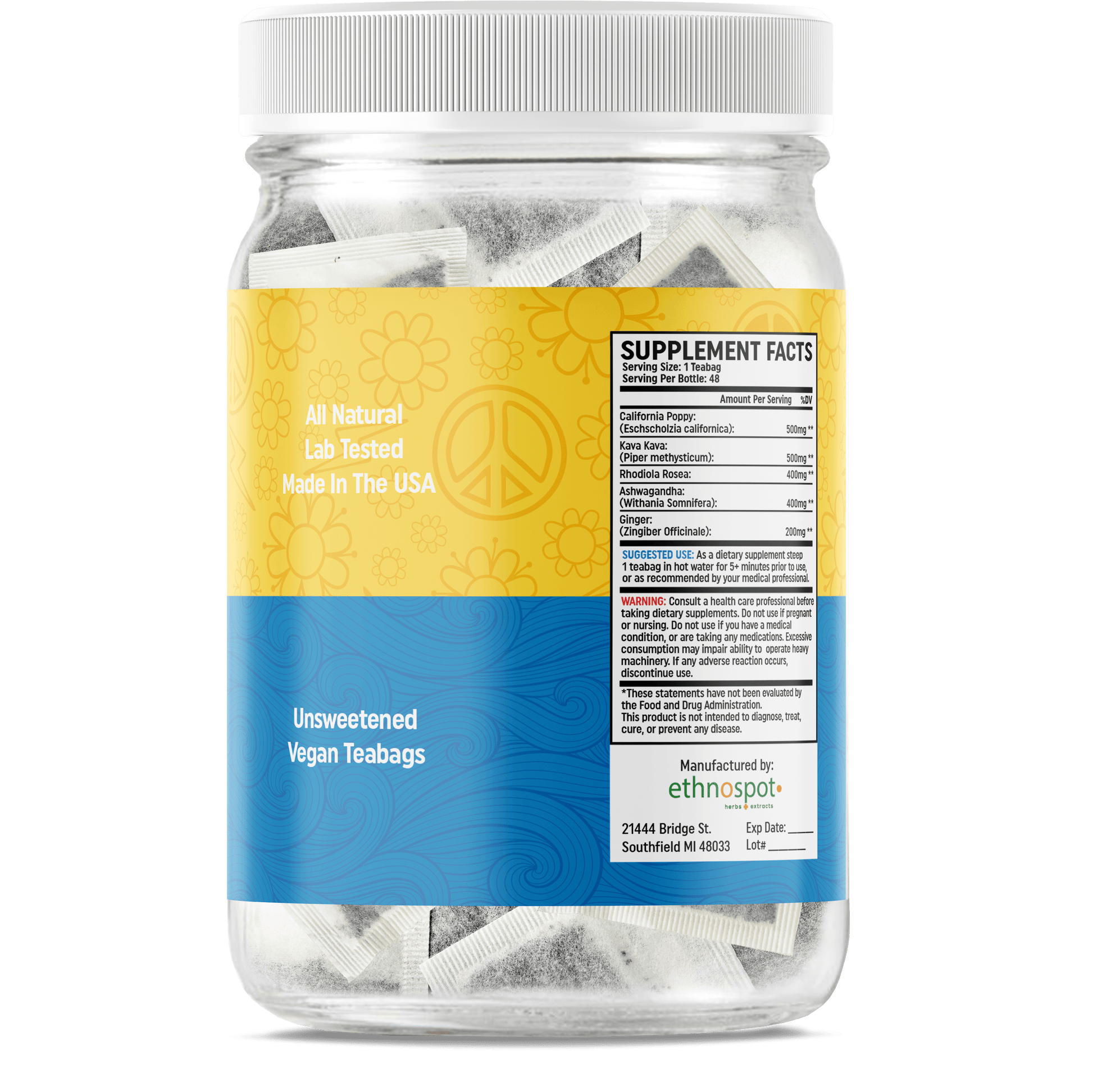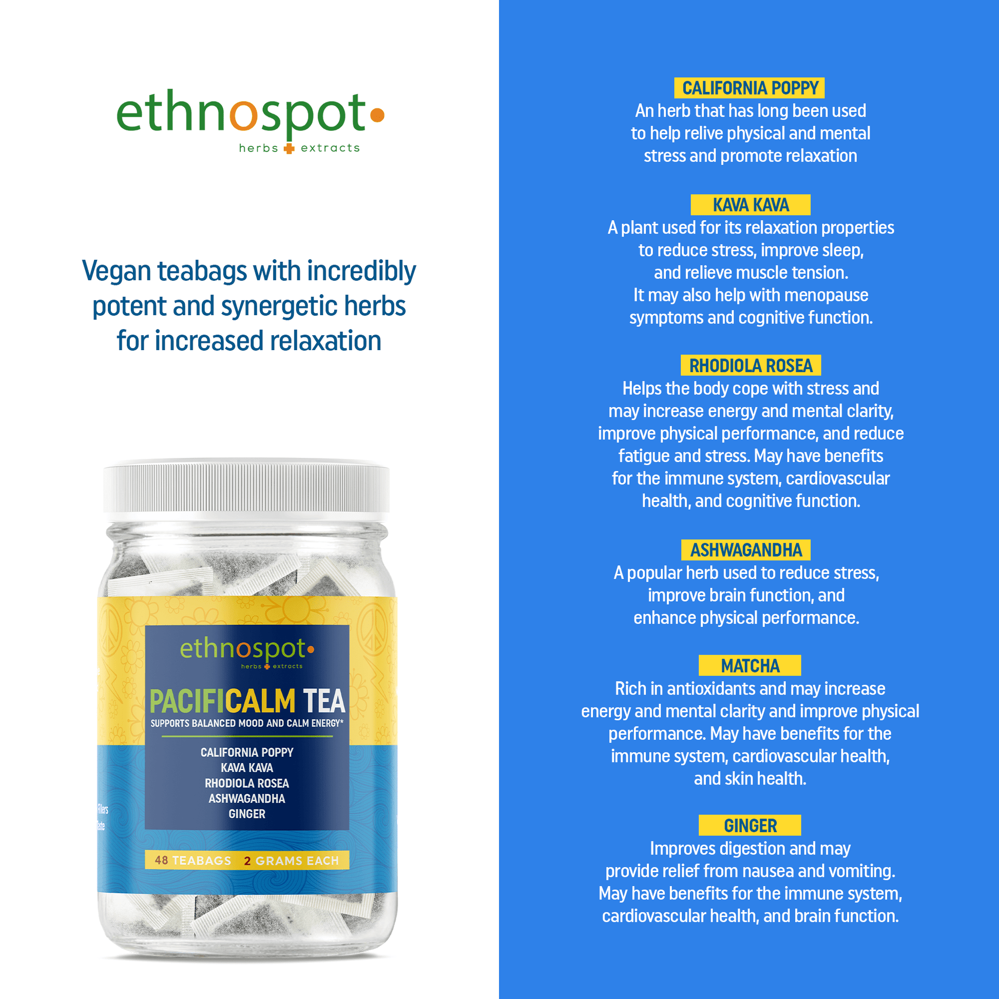 Ethnospot Herbal Supplements provide natural relaxation tea to help support clear-minded mental and physical relaxation. Our PacifiCalm Natural Relaxation Tea contains California Poppy, Kava Kava, Rhodiola Rosea, Ashwagandha, and Ginger to help promote a sense of calm and relaxation. Enjoy the soothing benefits of PacifiCalm, the perfect herbal tea blend designed to help you unwind anytime, whether during a stressful workday, before bedtime, or at social gatherings. Savor a cup of PacifiCalm to find tranquility and balance in the midst of life's chaos. All of these ingredients are carefully sourced from organic sources in order to ensure the highest quality. We offer 48 vegan teabags per box so you can enjoy a cup of tea whenever you need it. Enjoy the benefits of natural relaxation with Ethnospot Herbal Supplements today!