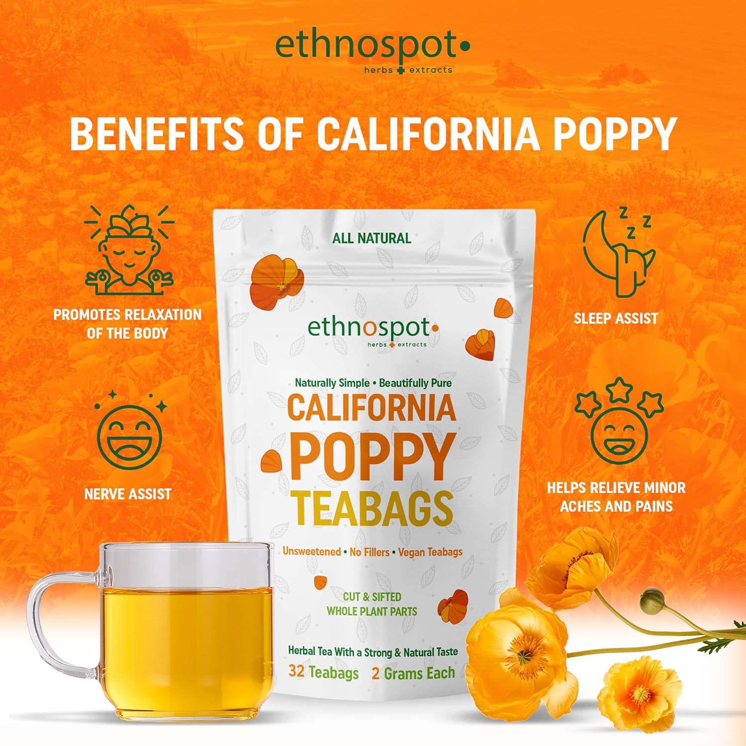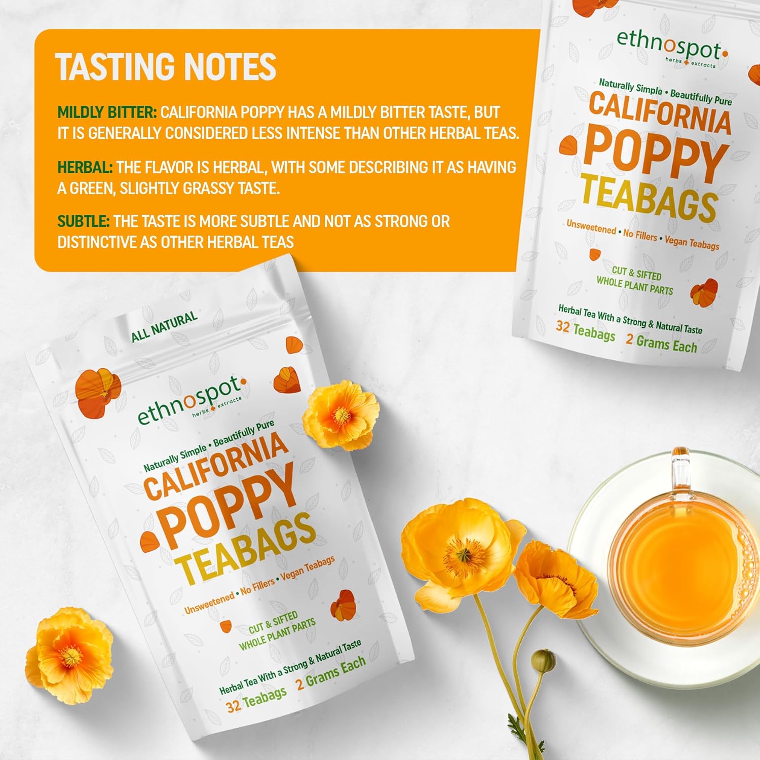 - Natural and Vegan: Made from 100% natural California Poppy, our tea contains no artificial ingredients or preservatives. Each teabag is vegan-friendly, providing a wholesome, plant-based beverage that fits perfectly into a healthy, natural lifestyle. Enjoy the pure essence of California Poppy with confidence and ease.