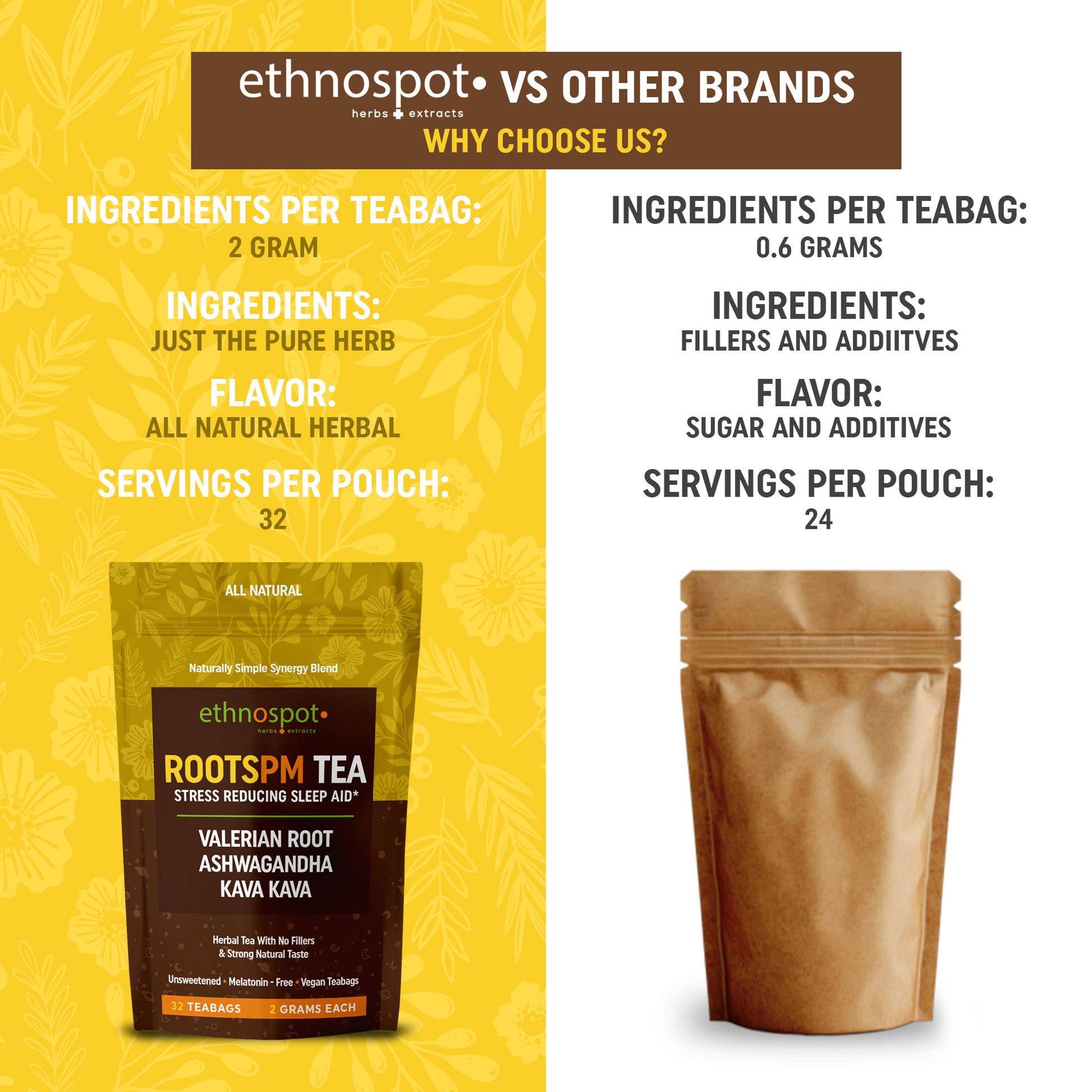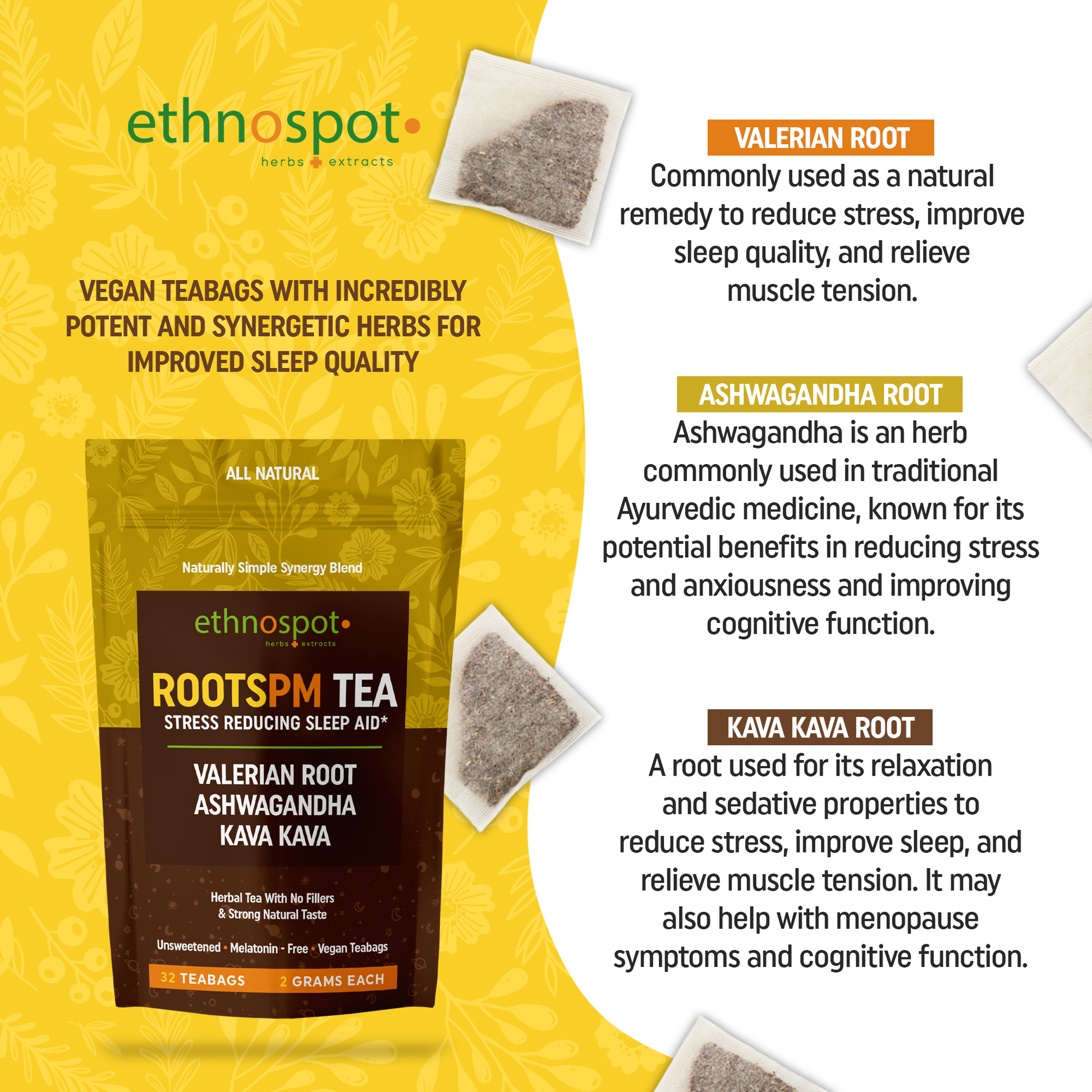 - Potent Herbal Blend with No Additives: RootsPM combines three powerful herbs—Valerian Root, Ashwagandha, and Kava Kava—known for their calming and relaxing properties. Made with 100% natural ingredients, these tea bags are free from fillers, caffeine, melatonin, and artificial additives, offering a pure and clean tea experience in every cup.